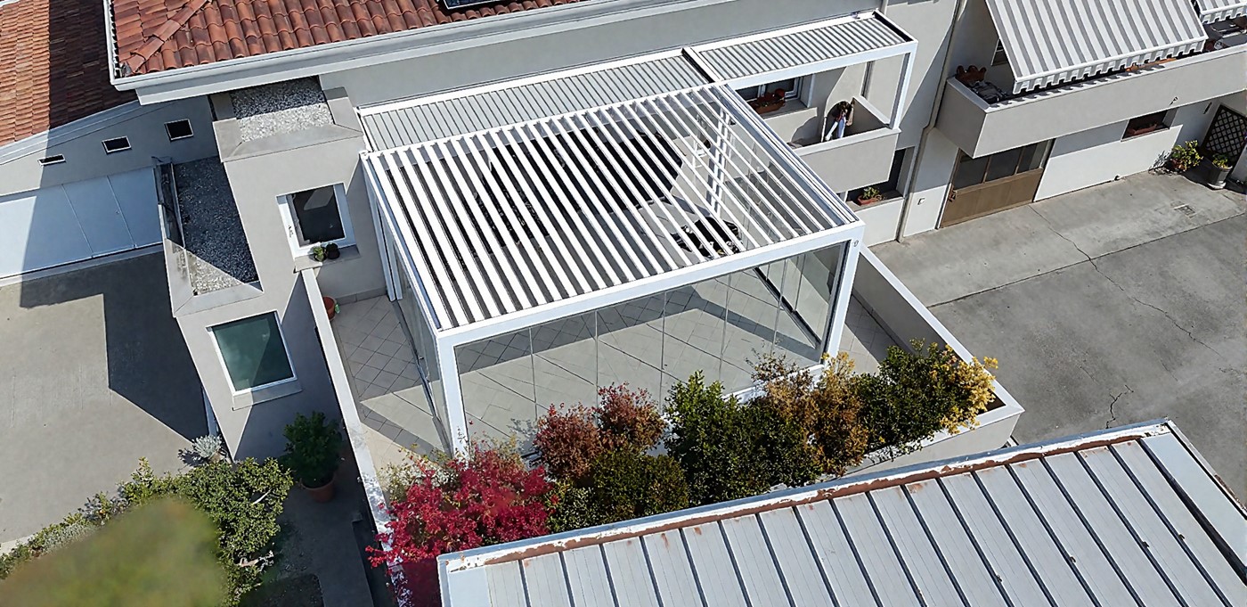 Ad Azzano Decimo, abbiamo trasformato la terrazza di un attico in un nuovo spazio abitabile grazie all’installazione della pergola bioclimatica Pergosky. La struttura in alluminio si distingue per il suo design moderno e minimale, ma il vero punto di forza è il sistema tutto vetro scorrevole, posizionato all’esterno delle piantane. Questo accorgimento tecnico crea un suggestivo effetto "House of Glass", donando luminosità, leggerezza e continuità visiva tra interno ed esterno.